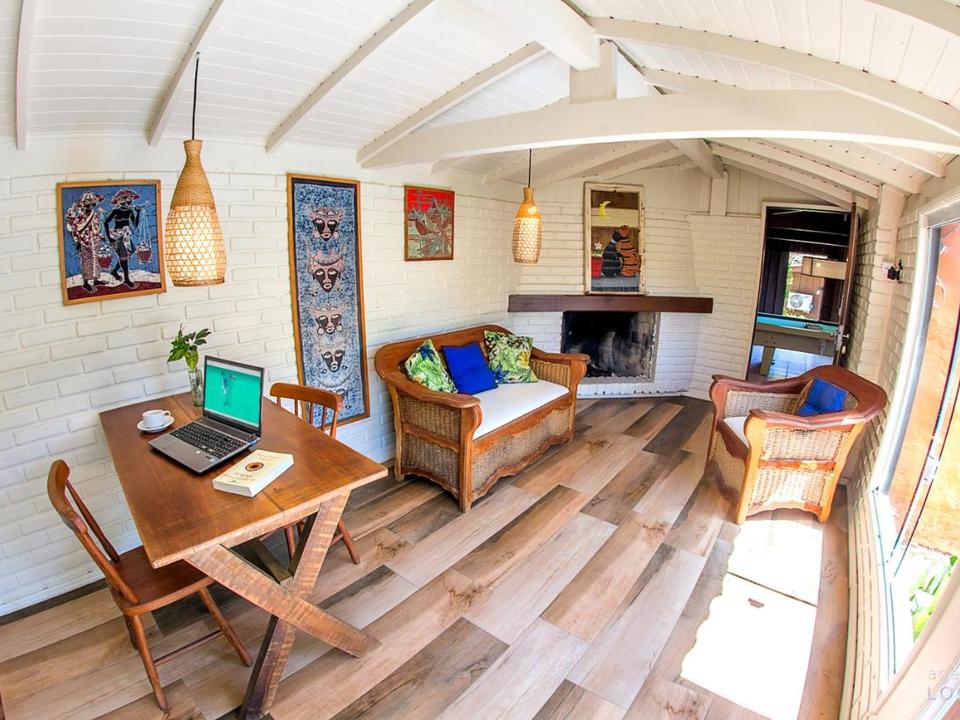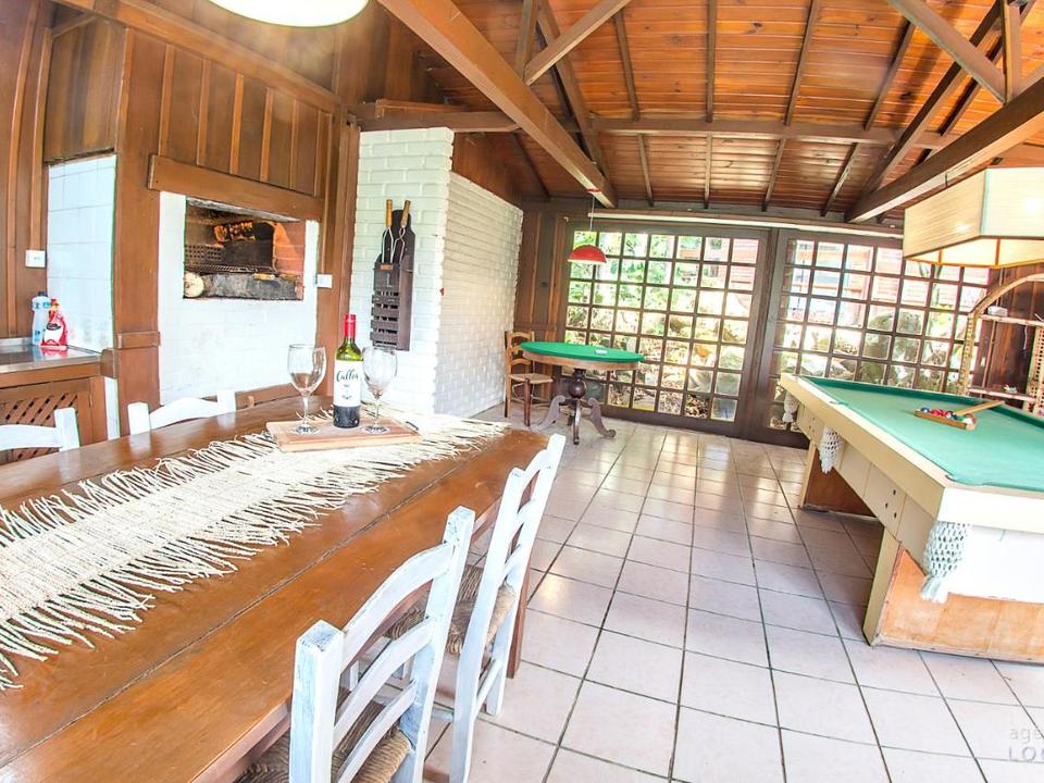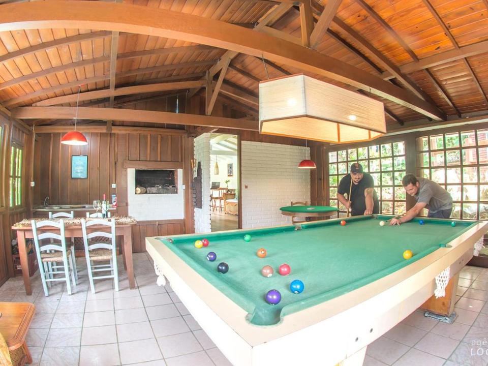 Contamos também com piscina, dois quiosques com churrasqueira no jardim, serviço de bar na recepção, sala de jogos com churrasqueira, sala de estar, serviço de praia e estacionamento.