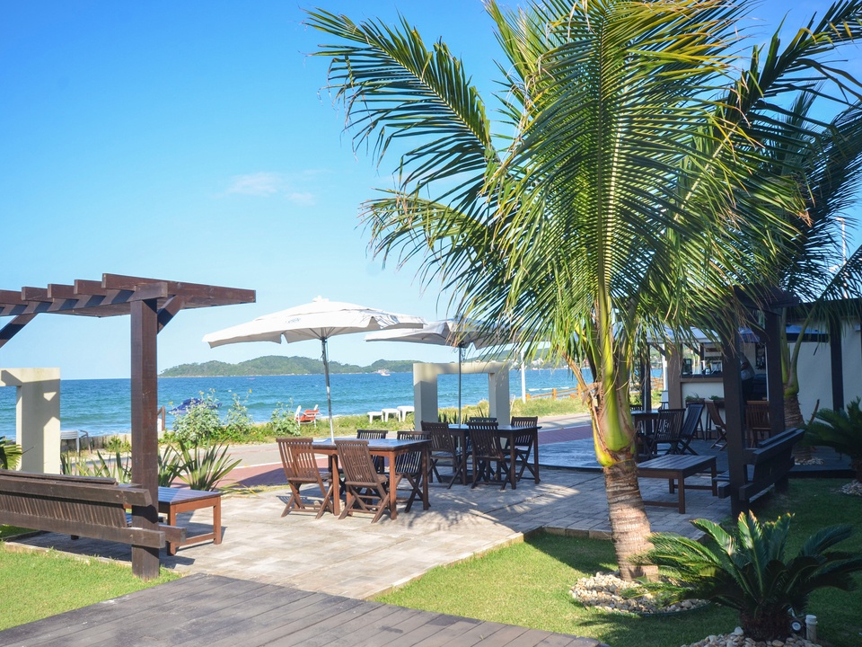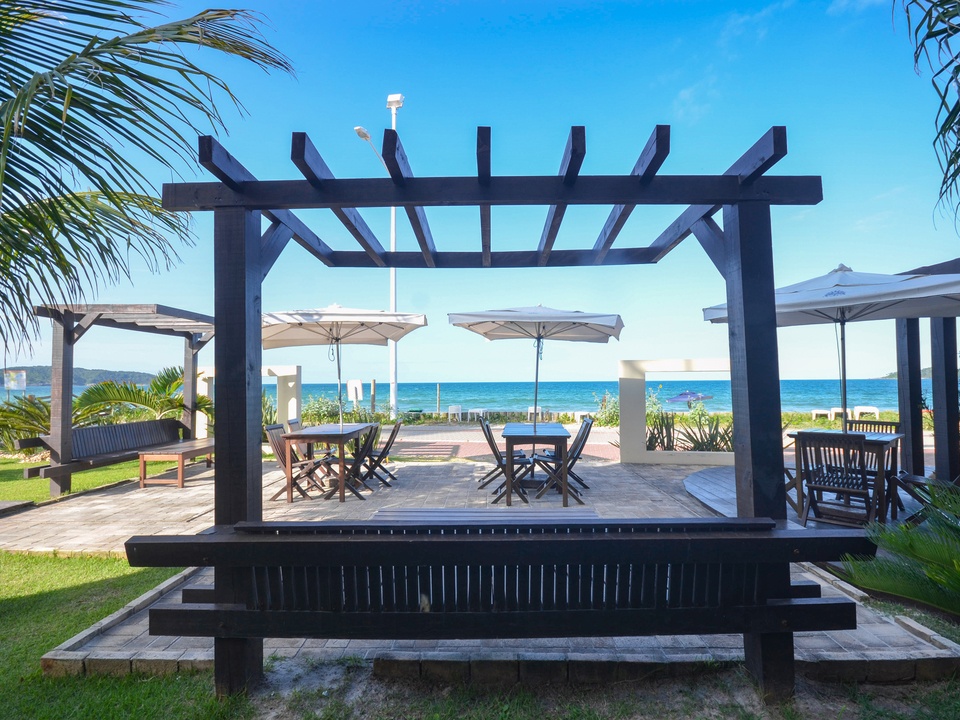 5 - A pousada conta com um KIOSKE beira mar que atende os hóspedes com lanches, petiscos, sucos, etc. Horário 09:00 ás 20:00 (de Setembro a Abril), podendo ser servido na praia ou no apartamento.