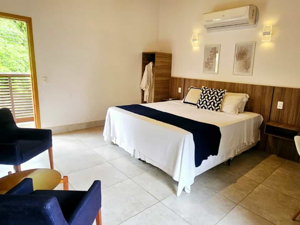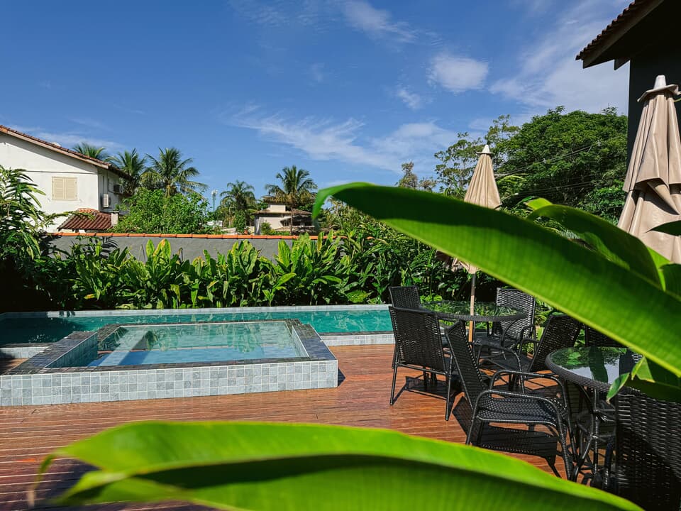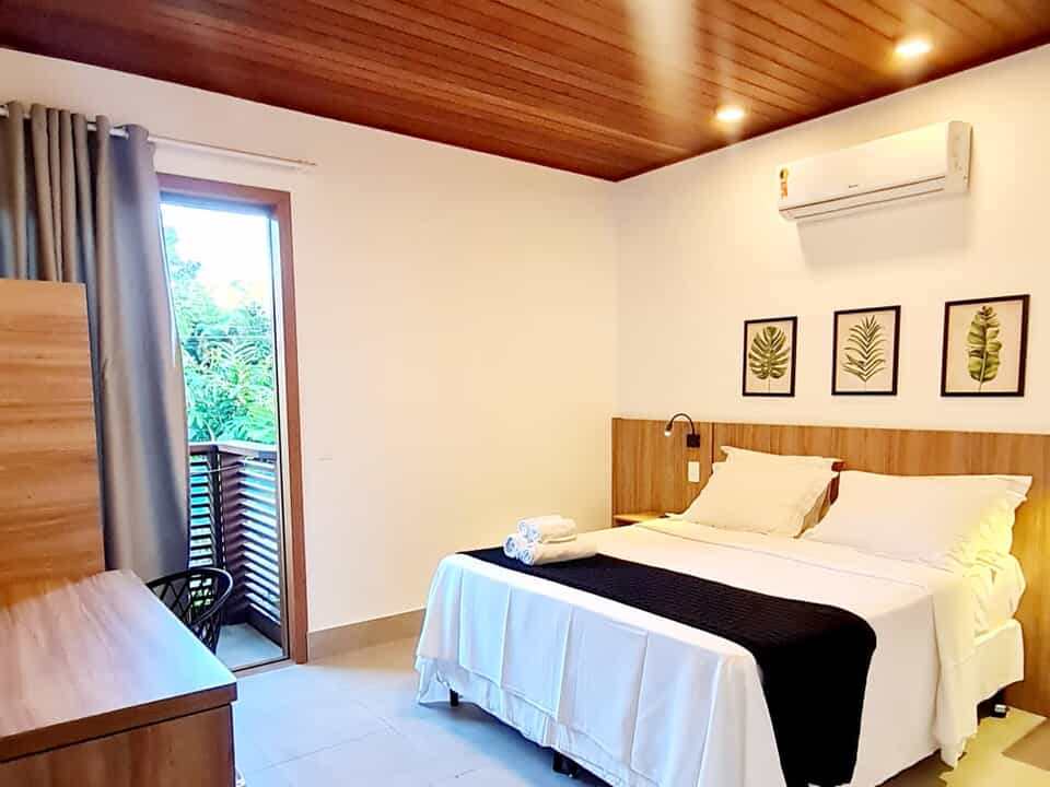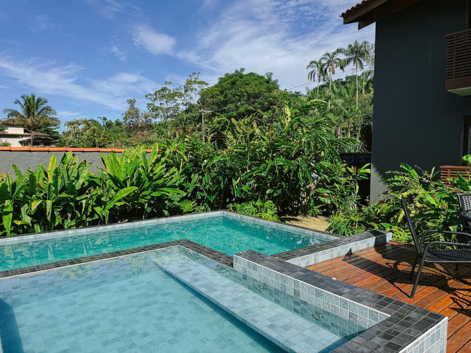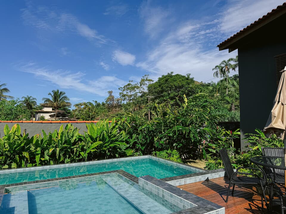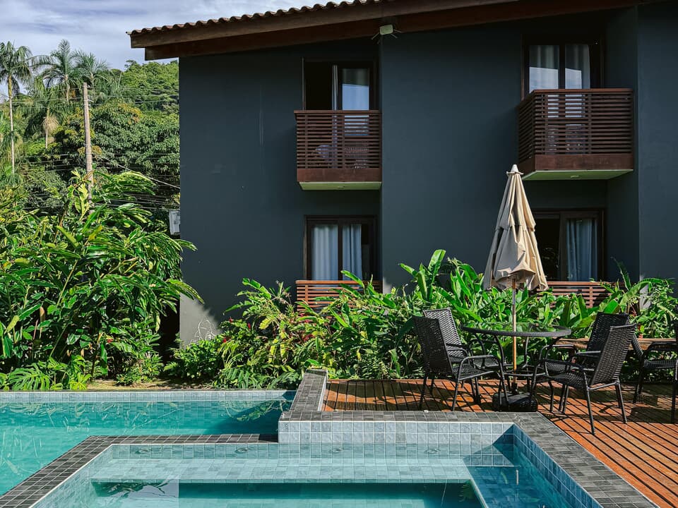 Todos nossos quartos tem varanda com vista para o jardim e nossa maravilhosa piscina com borda infinita.