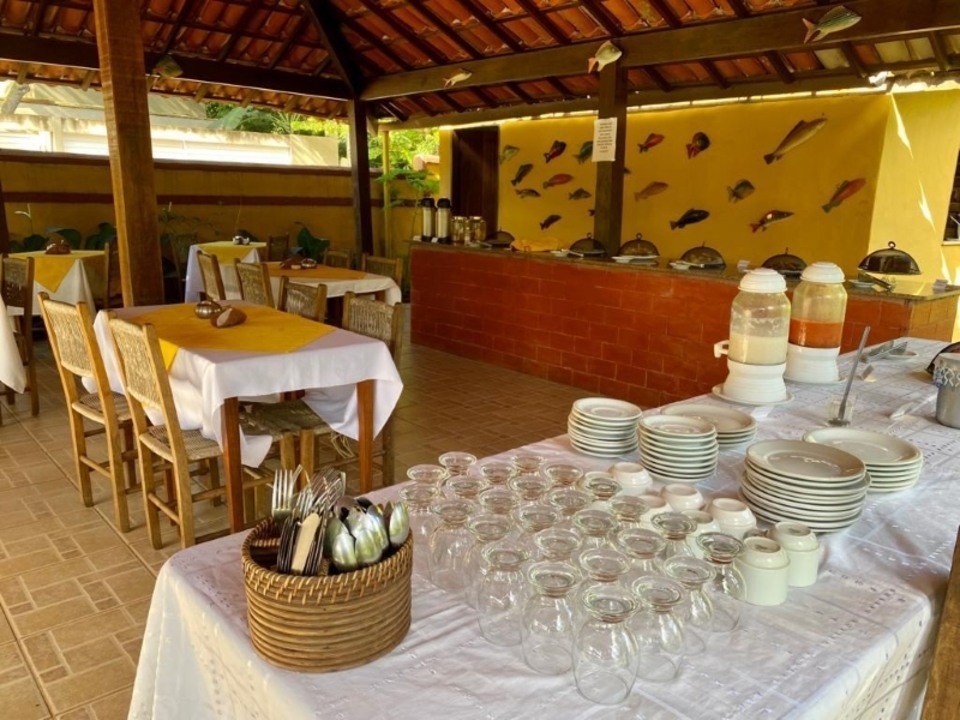 Você pode saborear um delicioso buffet de café da manhã numa ampla área verde, própria para este fim.