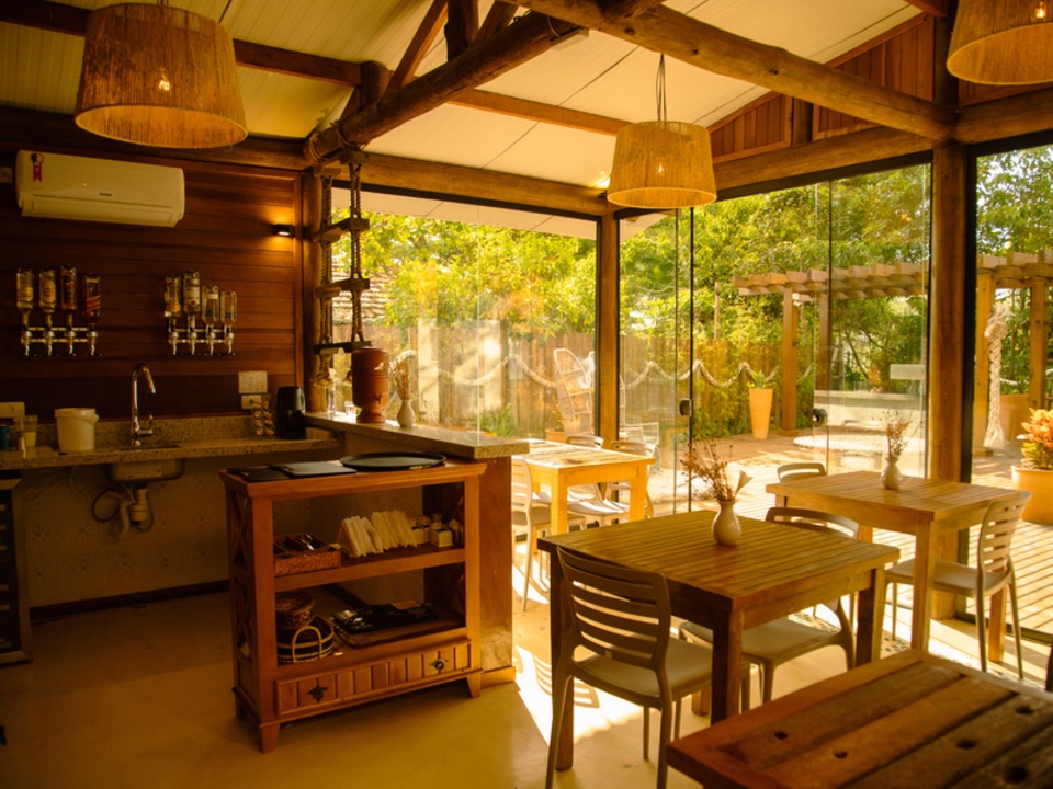 Em nossa área comum, dispomos de um deck mobiliado, perfeito para apreciar a bela vista, com serviço de atendimento que oferece drinks e petiscos durante todo o dia. O delicioso café da manhã está incluído em todas as diárias e, para o jantar, contamos com um restaurante casual fino, com a opção especial do dia oferecido pelo chef.