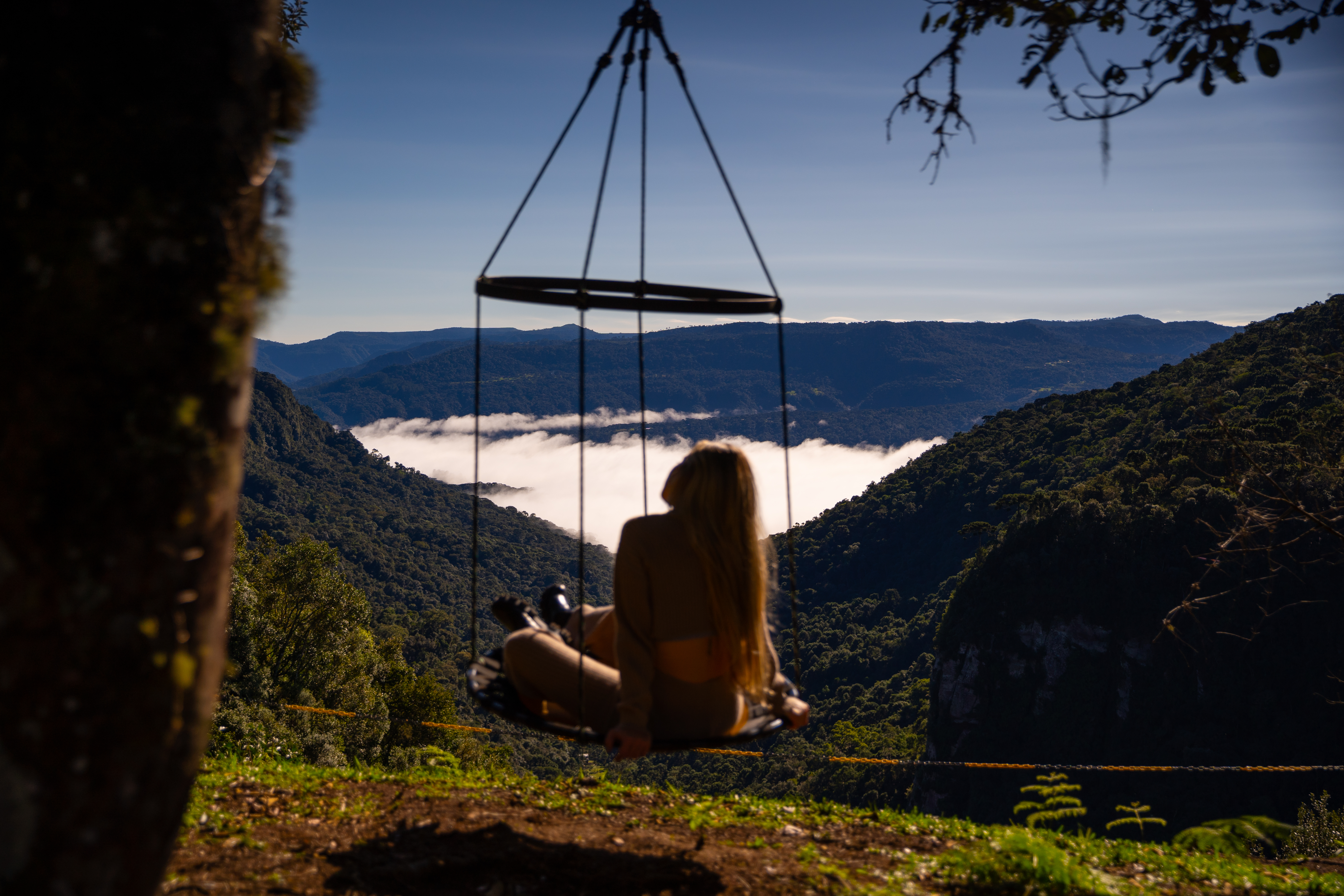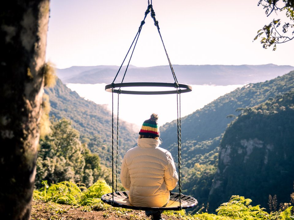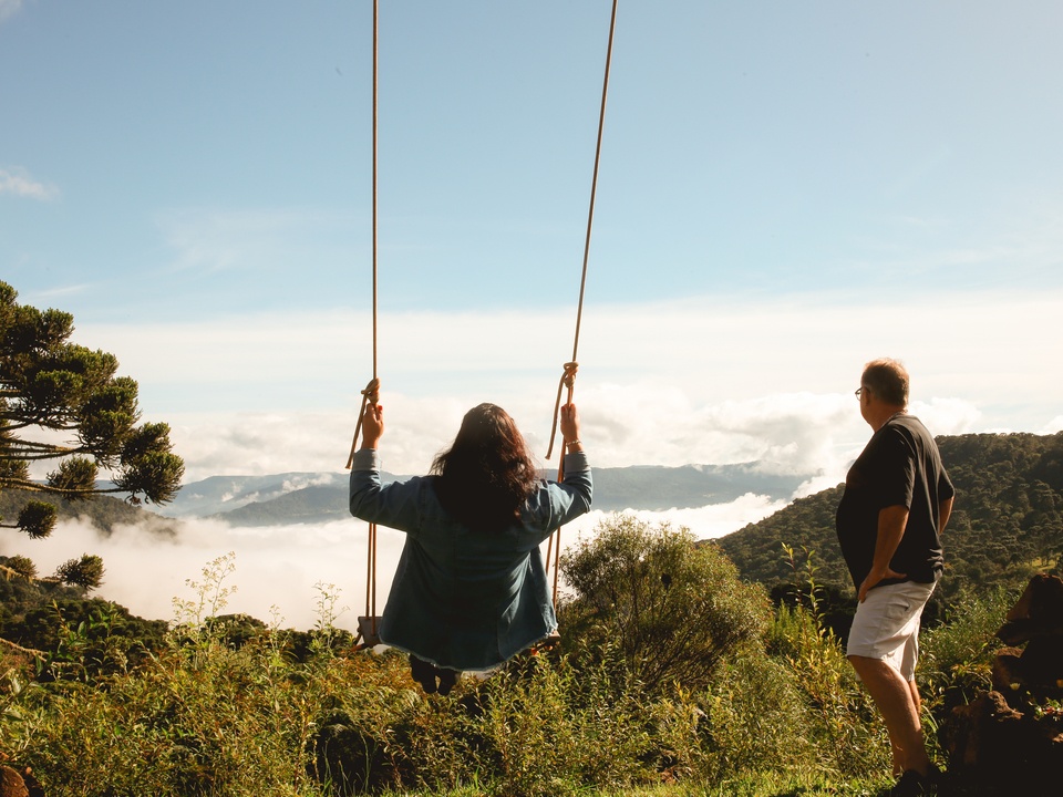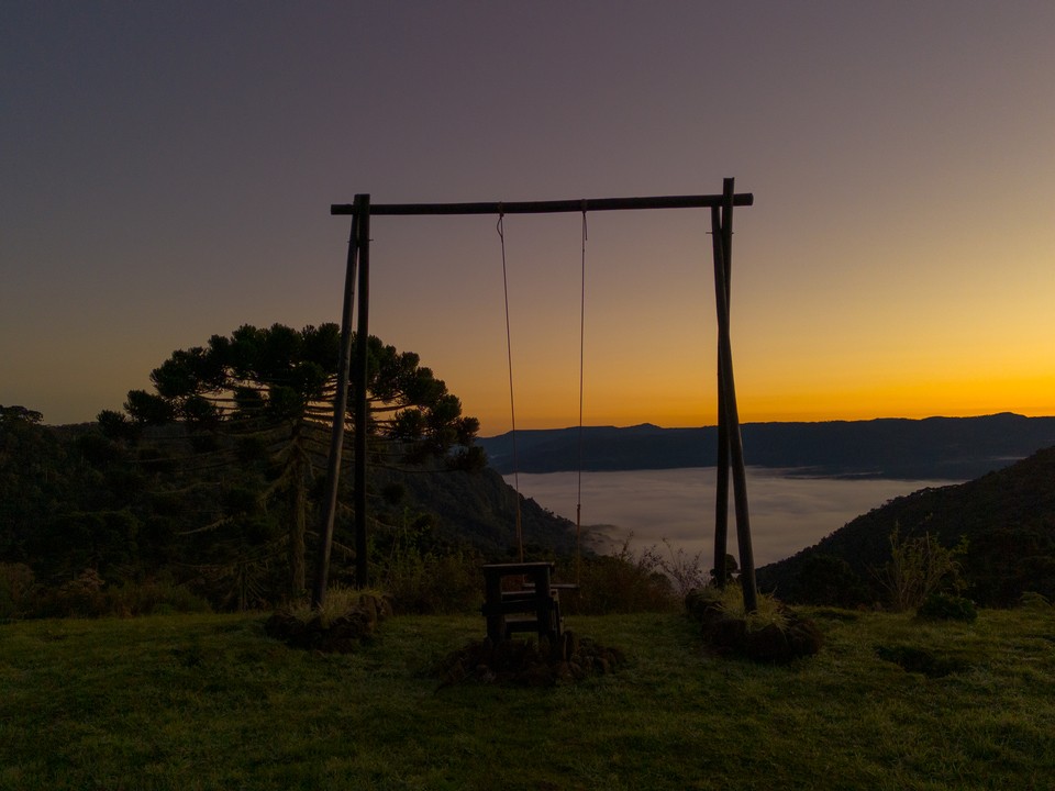 🌤️ Platô 1: Mirante Infinito, balanço sobre as nuvens e nascer do sol cinematográfico.