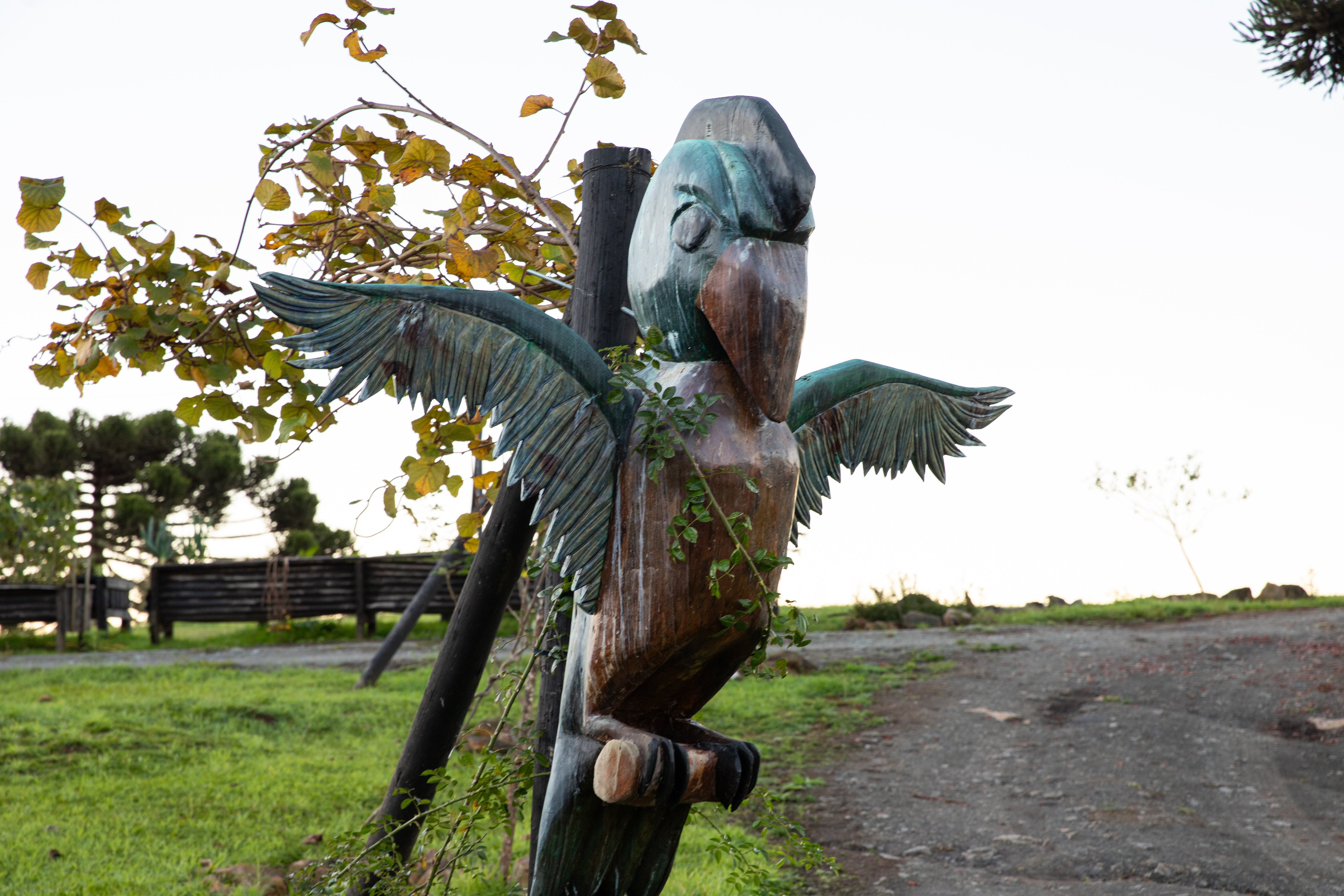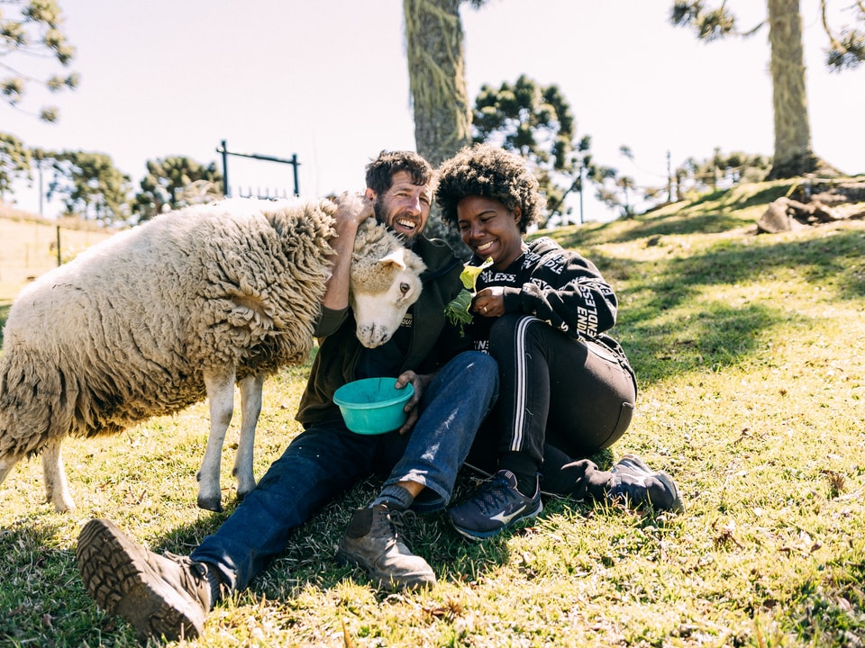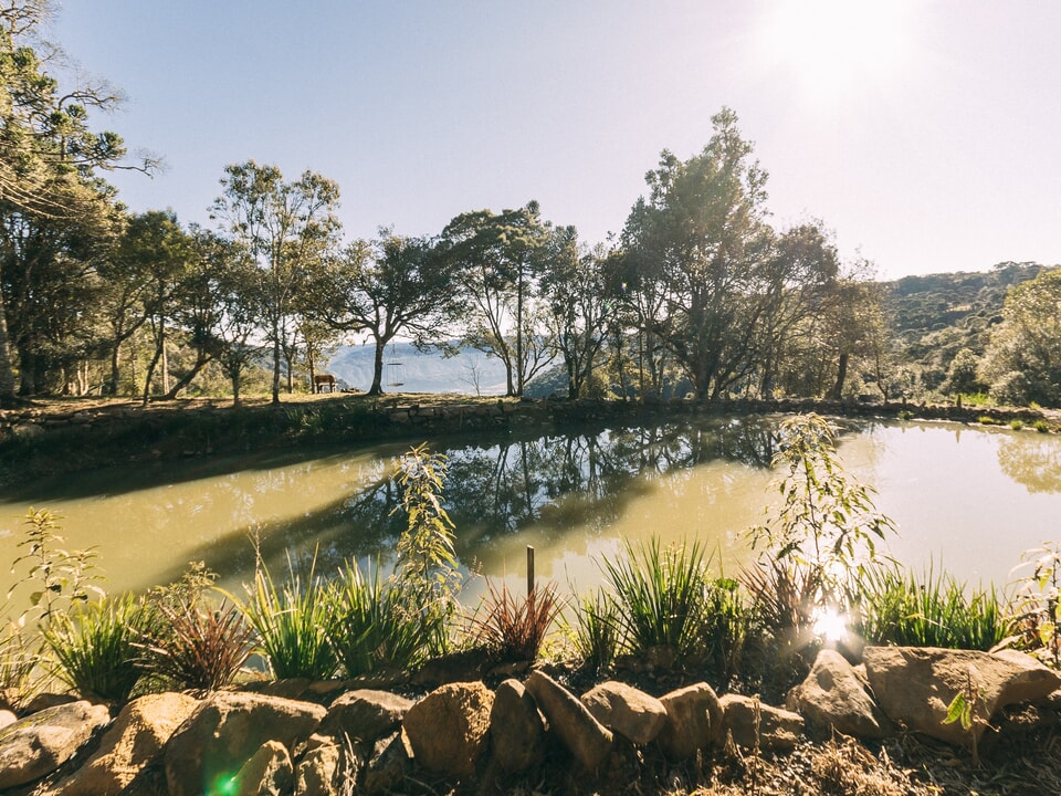 A propriedade abriga animais como ovelhas, gatos, cachorros, cavalos, patos e galinhas, além de fauna local que circula livremente.