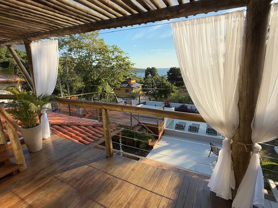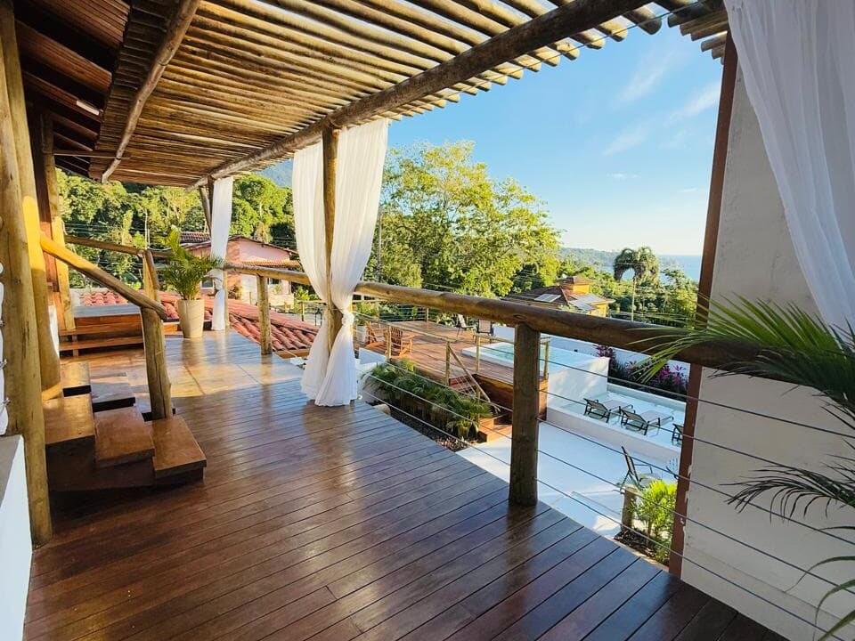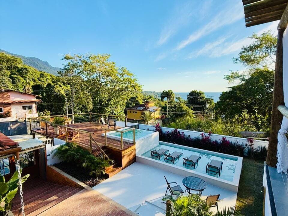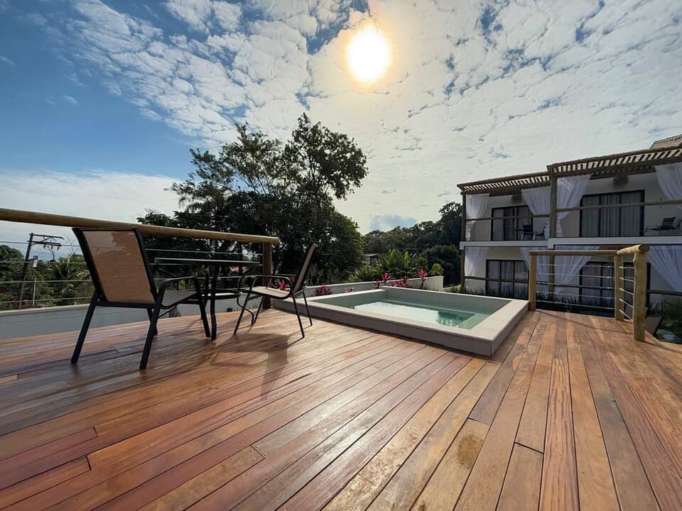Espaço Alma do Mar: relaxe após um dia de praia ou de cachoeira em nosso espaço especial: uma Spa climatizada e com água salinizada, um Espelho D'Água com espreguiçadeiras e um amplo Deck com vista mar com mesa e poltronas. Funcionamento das 11h às 21h.