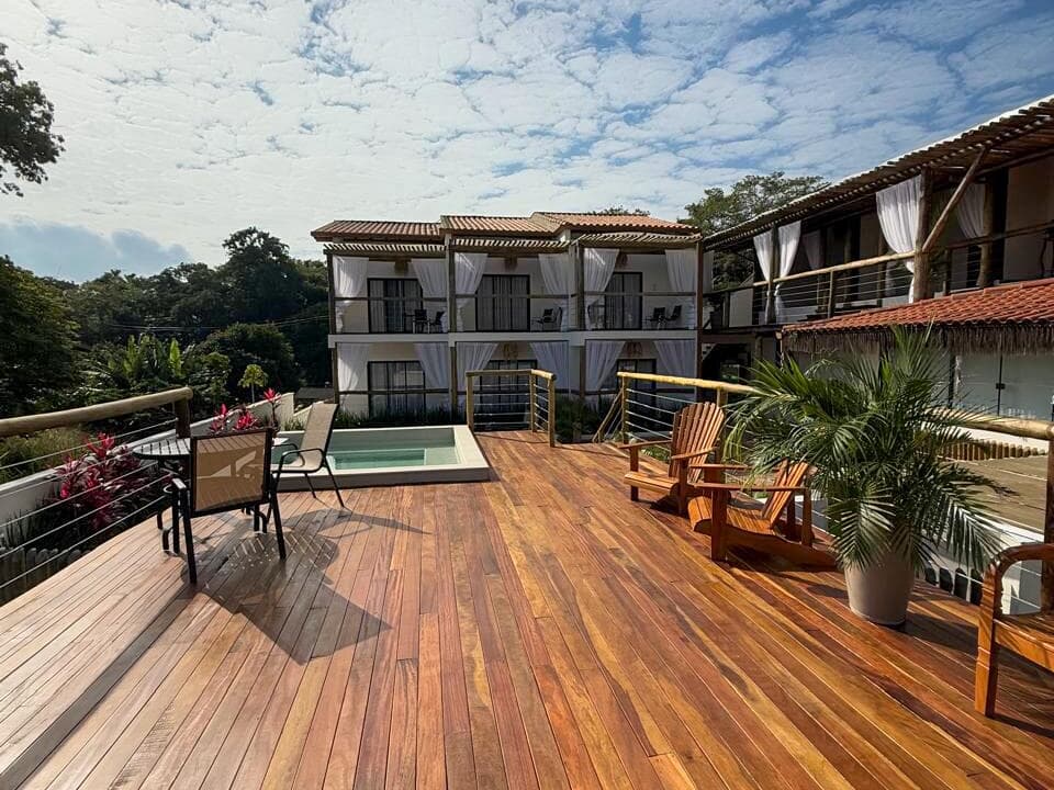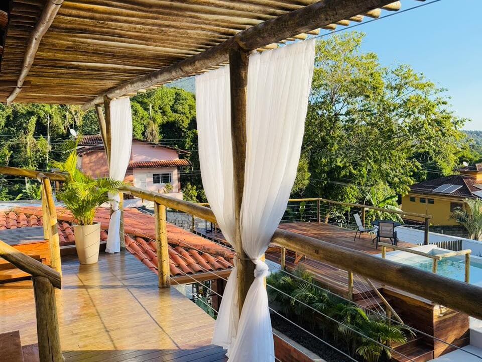 Nosso espaço conta com um spa de água climatizada e salinizada, um espelho d’água com espreguiçadeiras, além de um deck com mesa e poltronas — ideal para relaxar, compartilhar bons momentos ou simplesmente contemplar o pôr do sol.