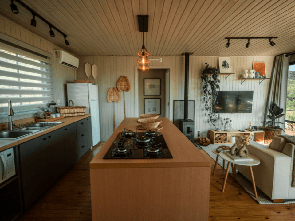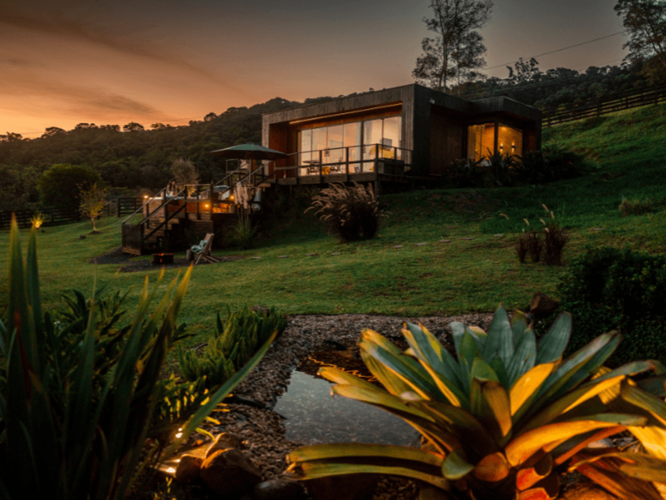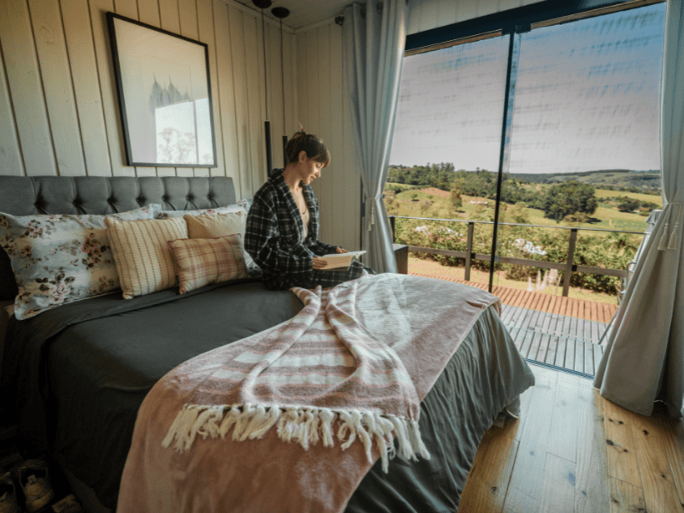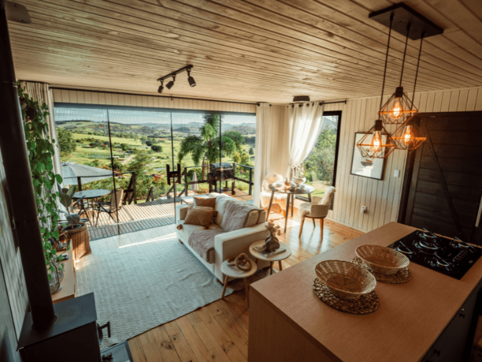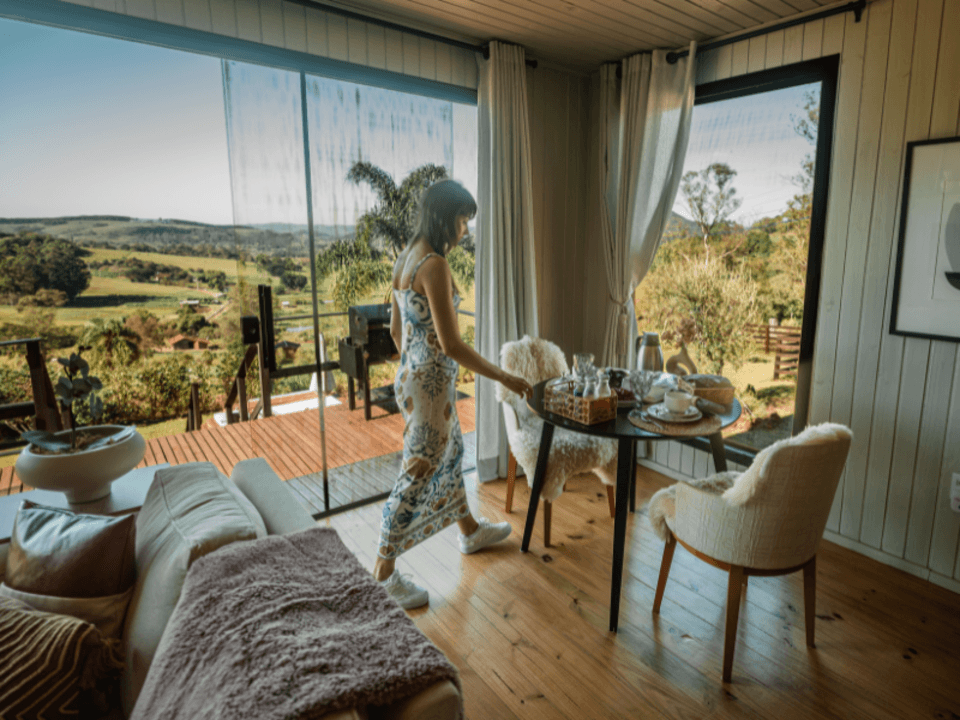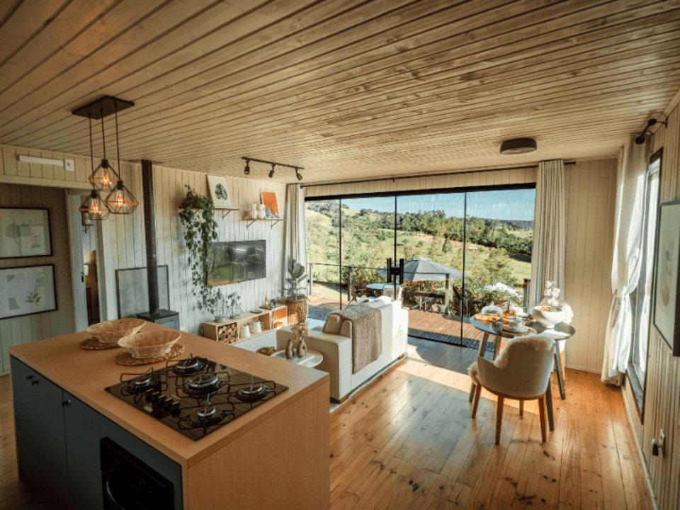 A Casa Origem oferece um quarto acolhedor, banheiro com banheira de imersão e vista panorâmica, além de cozinha e sala integradas, com lareira para noites inesquecíveis. A varanda, acessível pela sala e pelo quarto, conta com mesa e churrasqueira ao ar livre, complementada por uma banheira de hidromassagem externa.
