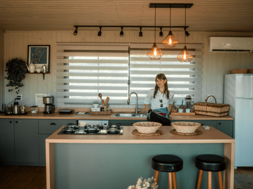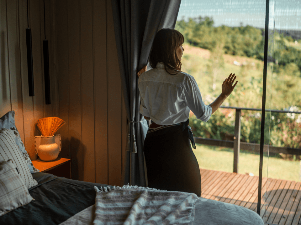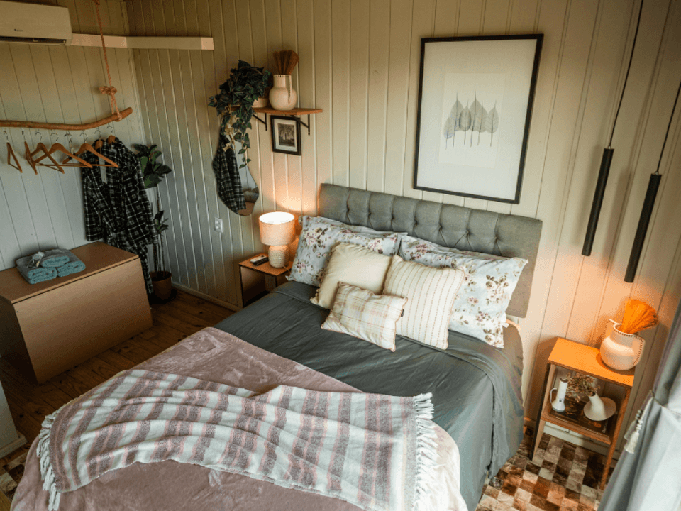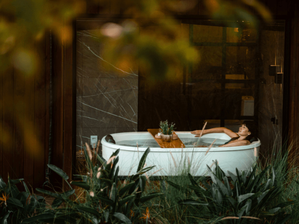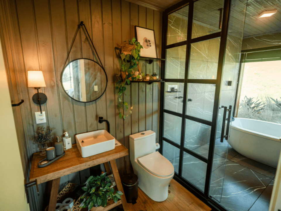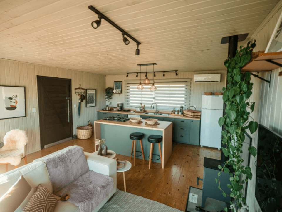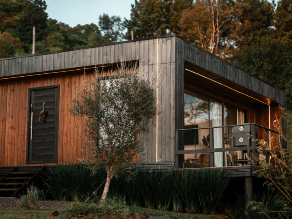 A Casa Origem oferece um quarto acolhedor, banheiro com banheira de imersão e vista panorâmica, além de cozinha e sala integradas, com lareira para noites inesquecíveis. A varanda, acessível pela sala e pelo quarto, conta com mesa e churrasqueira ao ar livre, complementada por uma banheira de hidromassagem externa.