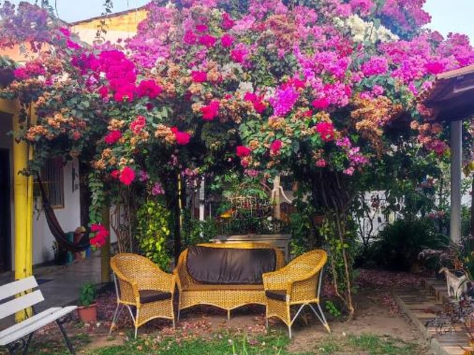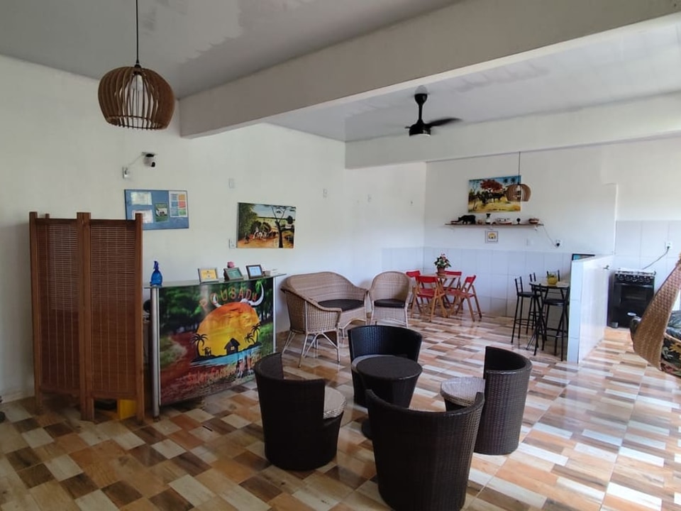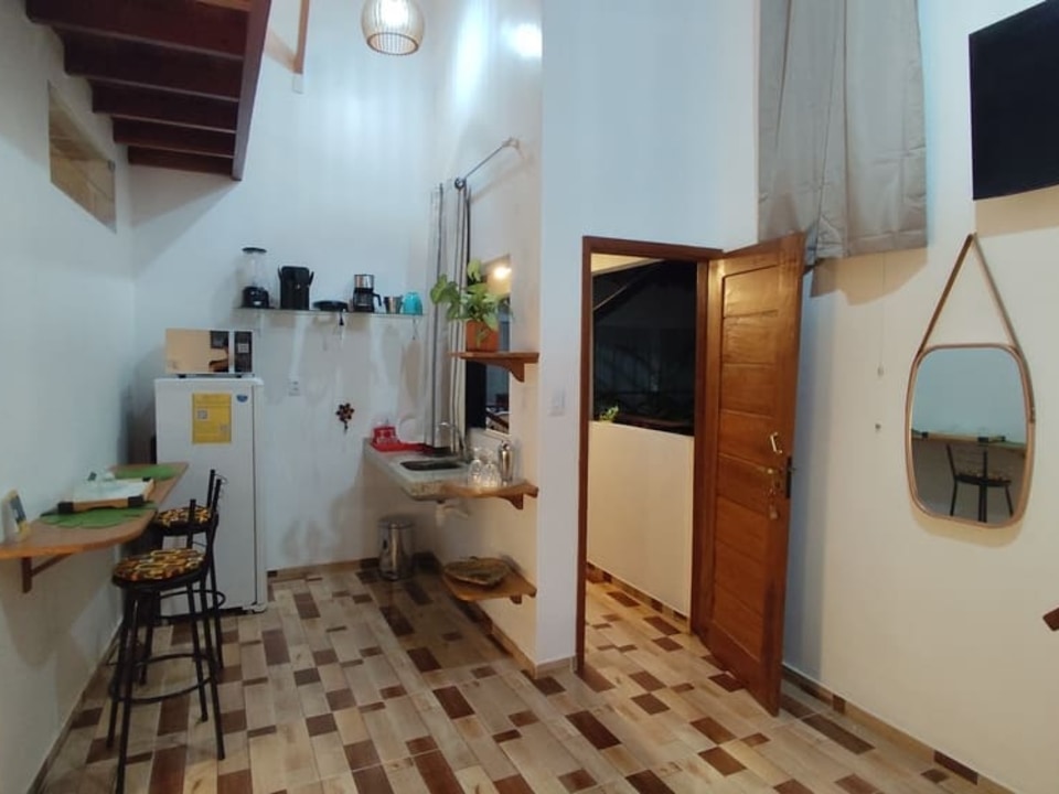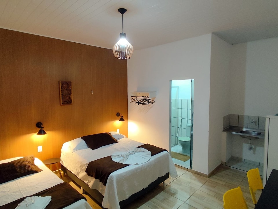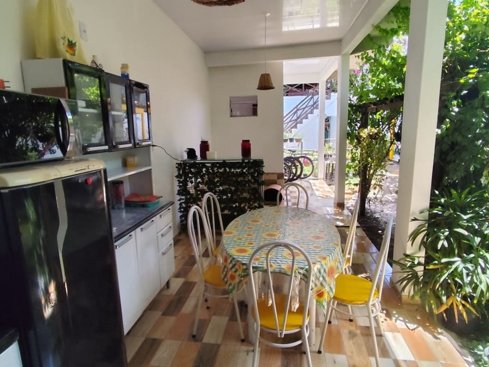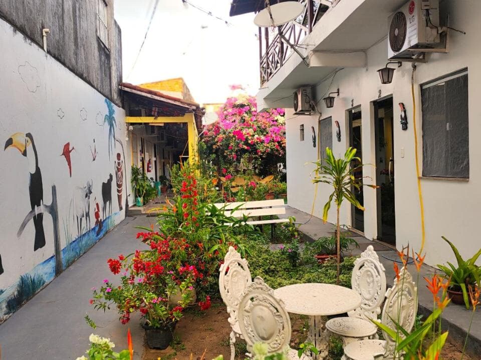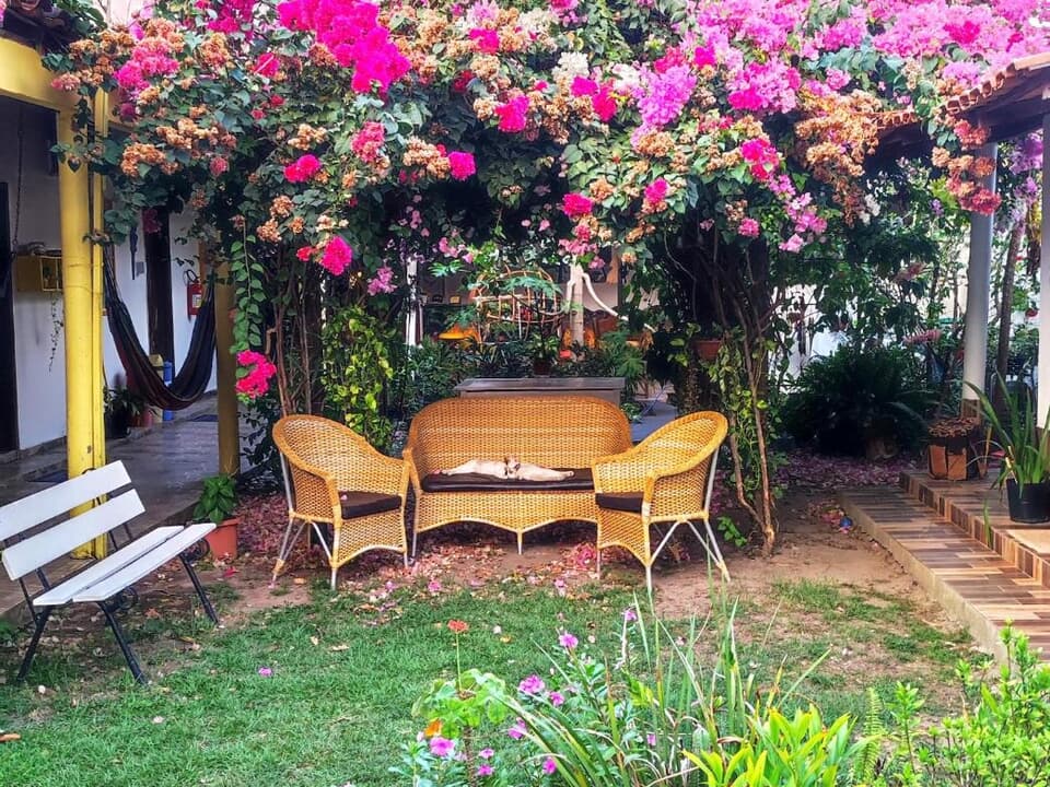 Contamos com suítes completas, equipadas com ar-condicionado, chuveiro elétrico, frigobar e TV a cabo, além de uma área de convivência encantadora, com jardim, sala de estar e cozinha compartilhada — perfeitas para relaxar após um dia de aventuras.