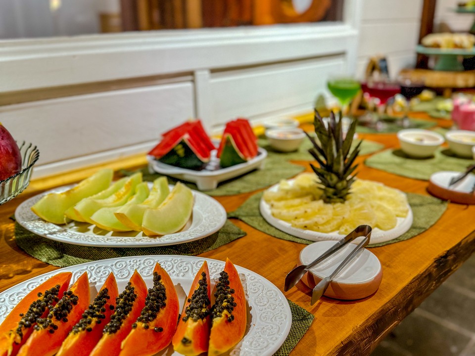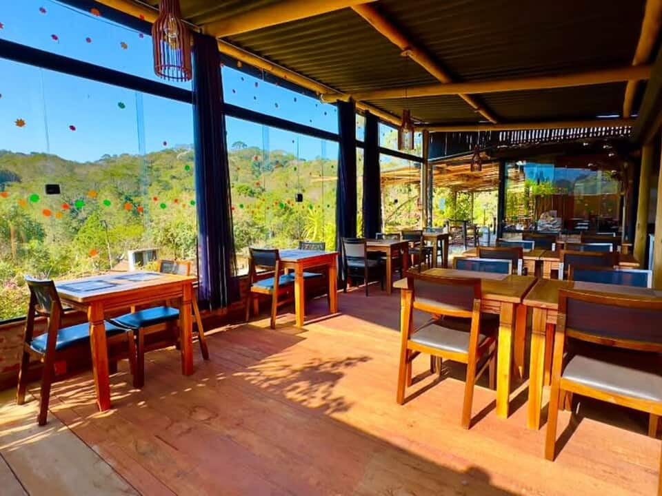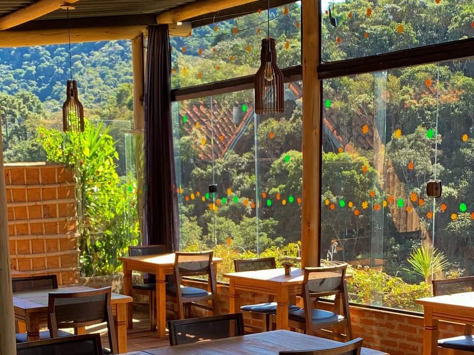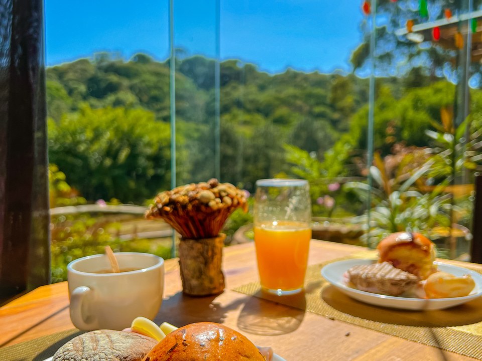 O café da manhã está incluído e é servido com vista para as montanhas, completando a atmosfera tranquila e acolhedora da pousada.