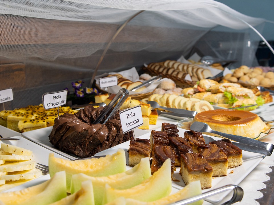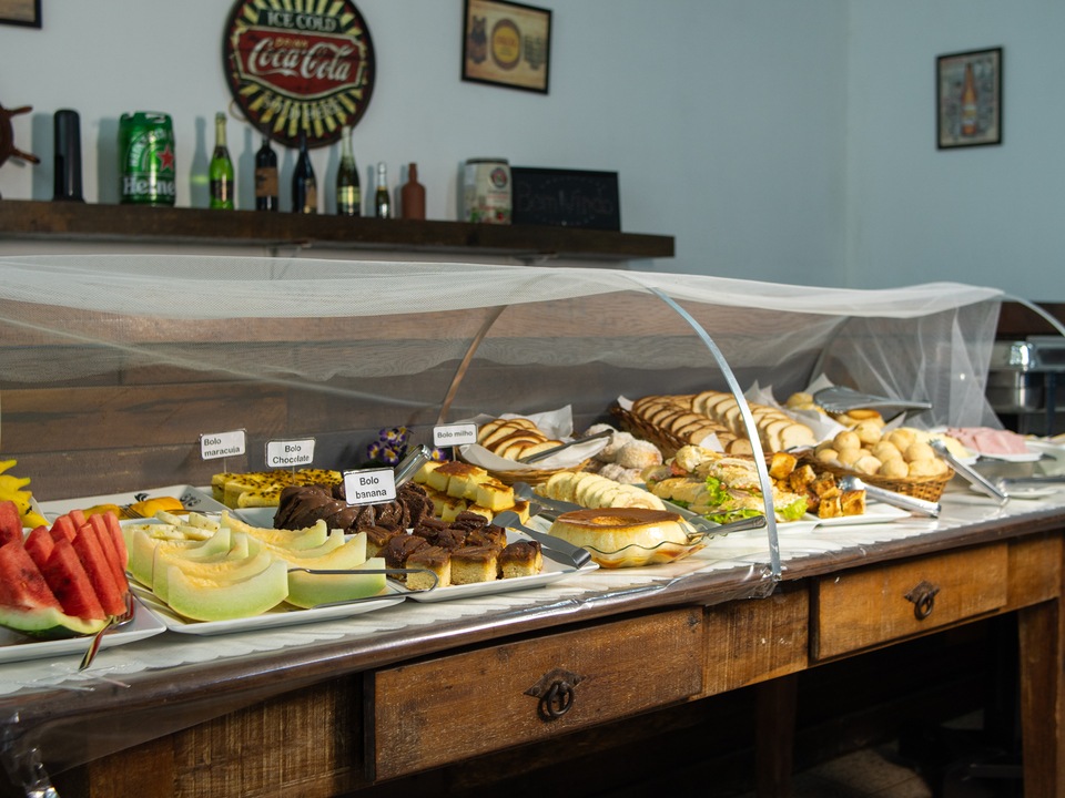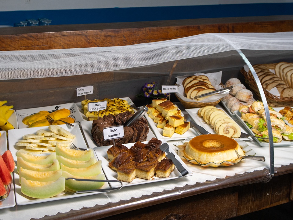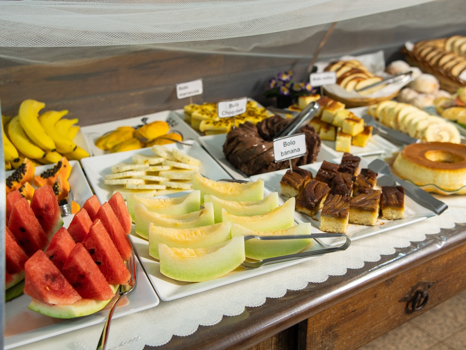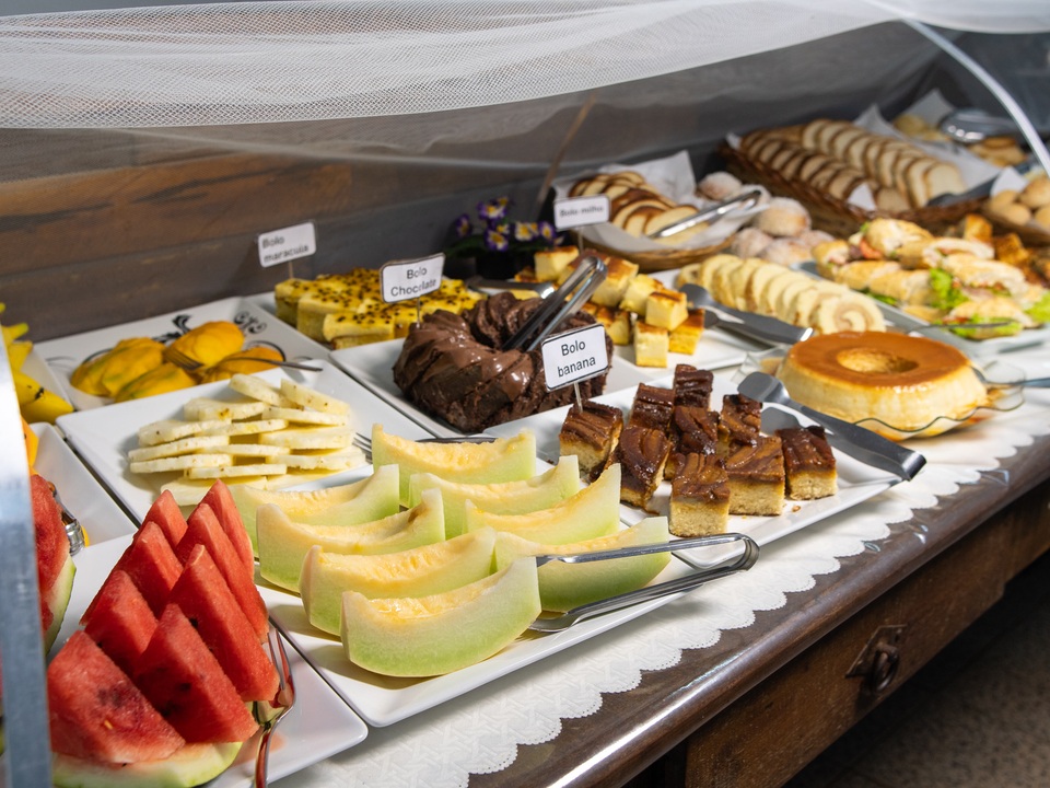 Delicioso e completo café da manhã, com pães e bolos caseiros, frutas da estação, sucos naturais e salgados leves, exatamente aquela refeição que revitaliza o corpo e a alma pela manhã.