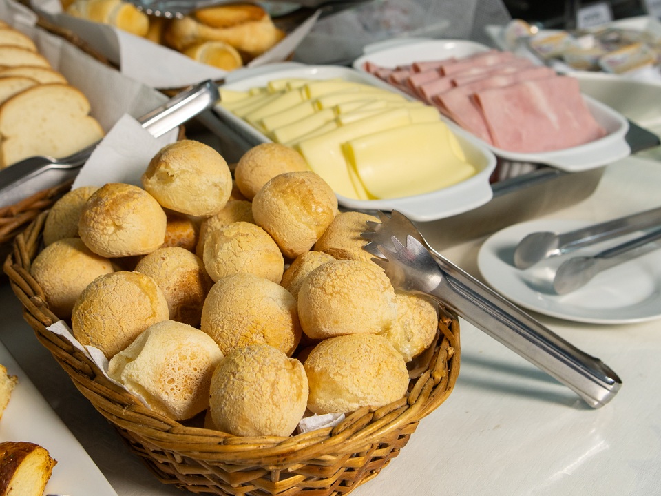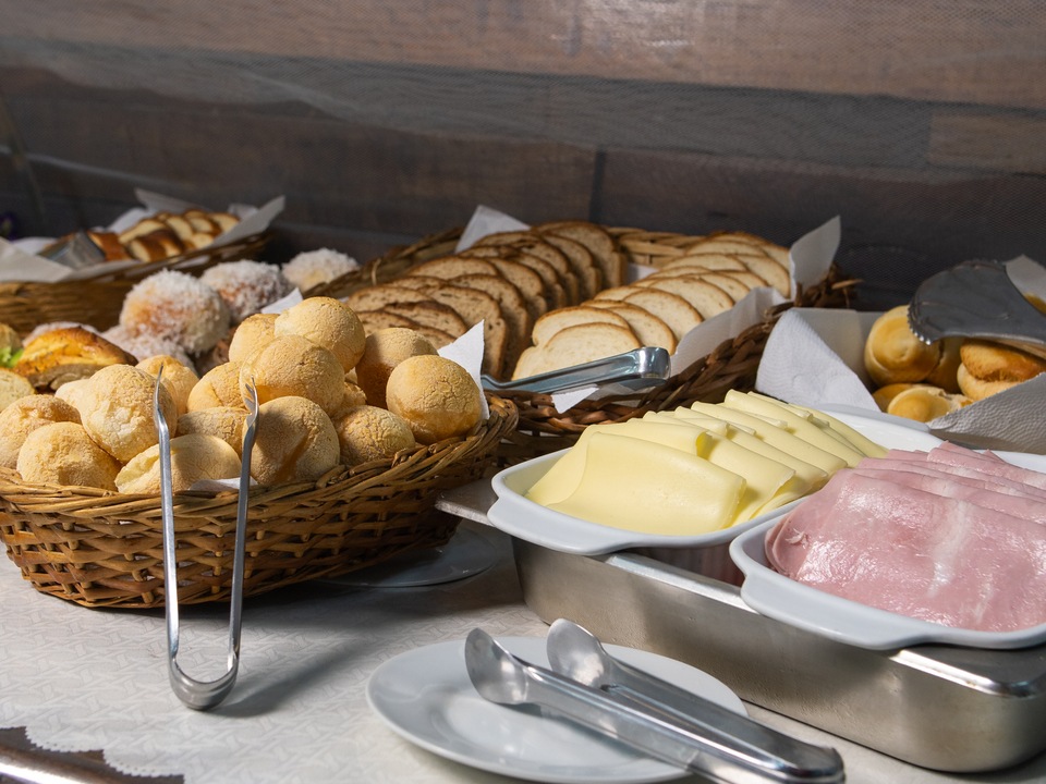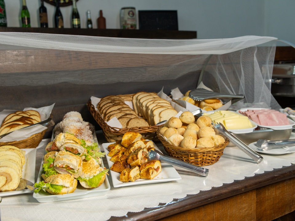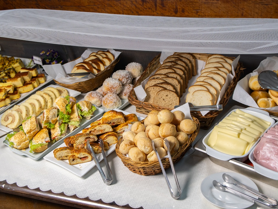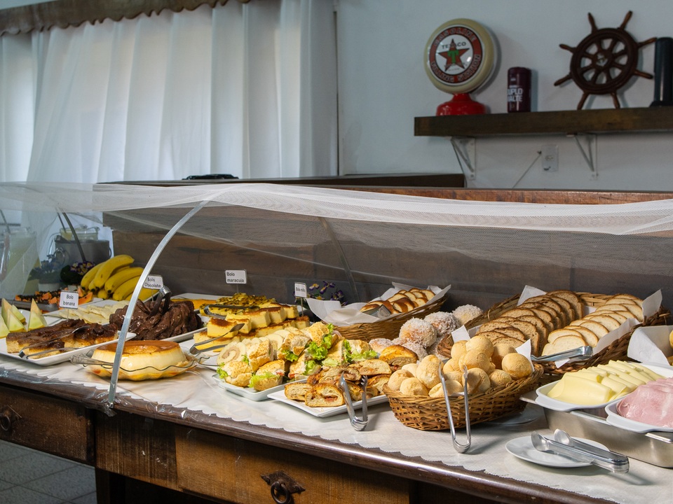 Delicioso e completo café da manhã, com pães e bolos caseiros, frutas da estação, sucos naturais e salgados leves, exatamente aquela refeição que revitaliza o corpo e a alma pela manhã.