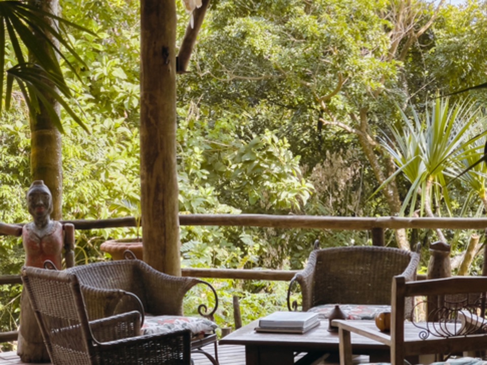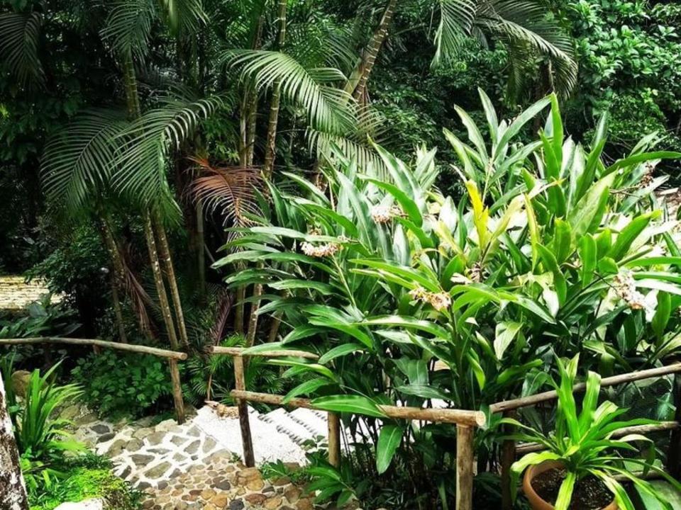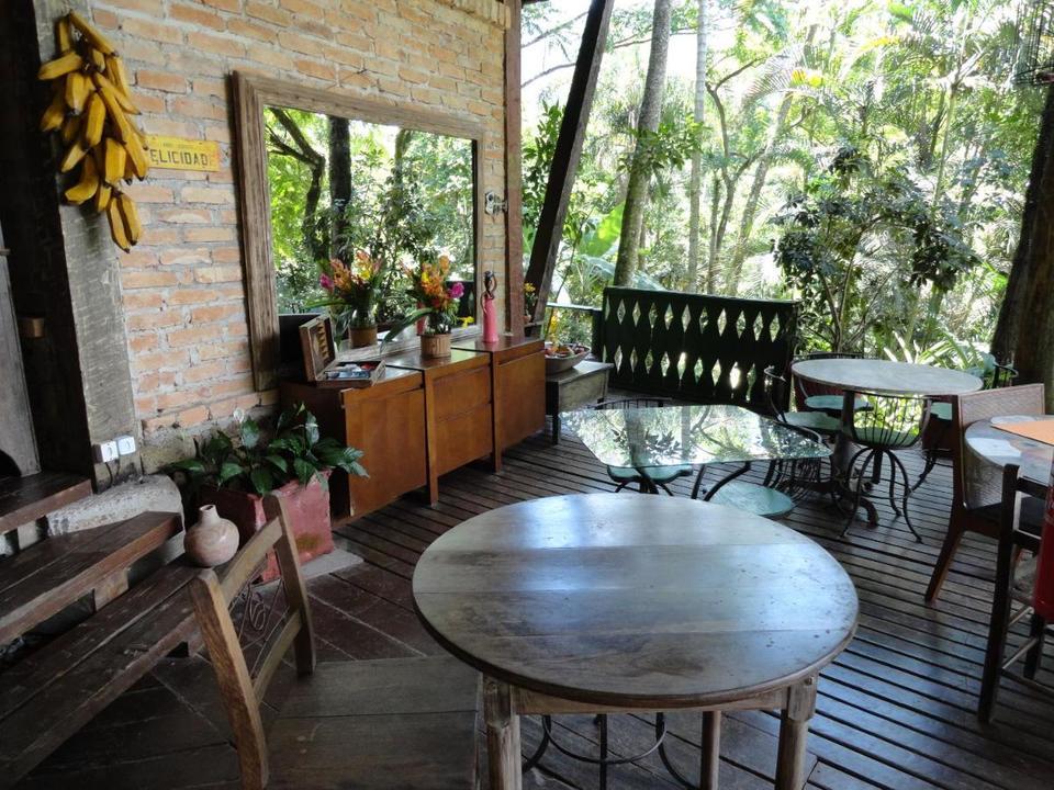 O café da manhã estilo buffet é servido ao lado da cachoeira, permitindo interação com a natureza e pássaros.